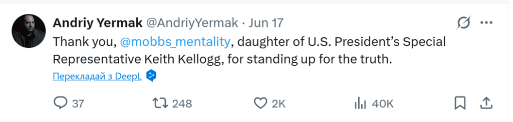 Керівник Офісу президента України Андрій Єрмак на своїй сторінці в соцмережі «Х» (колишній «Twitter») подякував доньці спецпредставника Президента США з питань України та Росії за її позицію щодо України: «Дякую, @mobbs_mentality, донько спеціального представника президента США Кіта Келлога, за те, що відстоюєш правду», написав Андрій Єрмак.