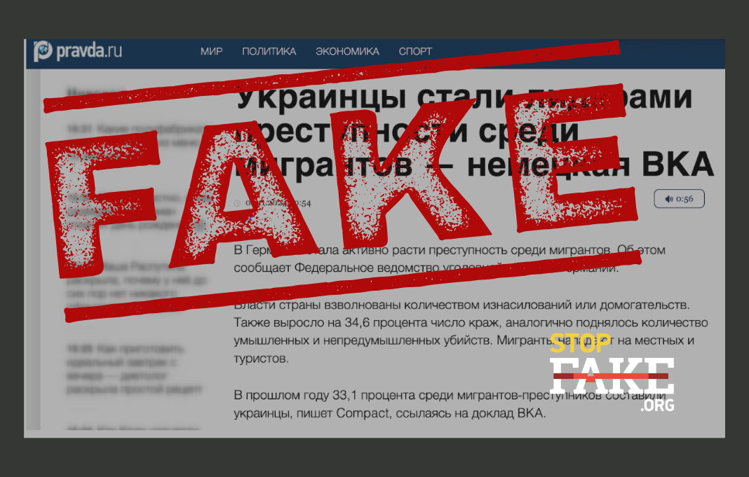Але даними зманіпулювали, і про це повідомляють у StopFake. Насправді таке відсоткове значення (33,1%) використали у звіті на позначення частки українців серед усіх мігрантів, які проживають у Німеччині. Натомість підозрюваними у скоєнні злочинів стали 11,6% українських біженців. Для порівняння, показники вихідців із Сирії — 21,4% та 19,2% відповідно. До того ж згідно зі звітом, вони й лідирують серед мігрантської злочинності.
