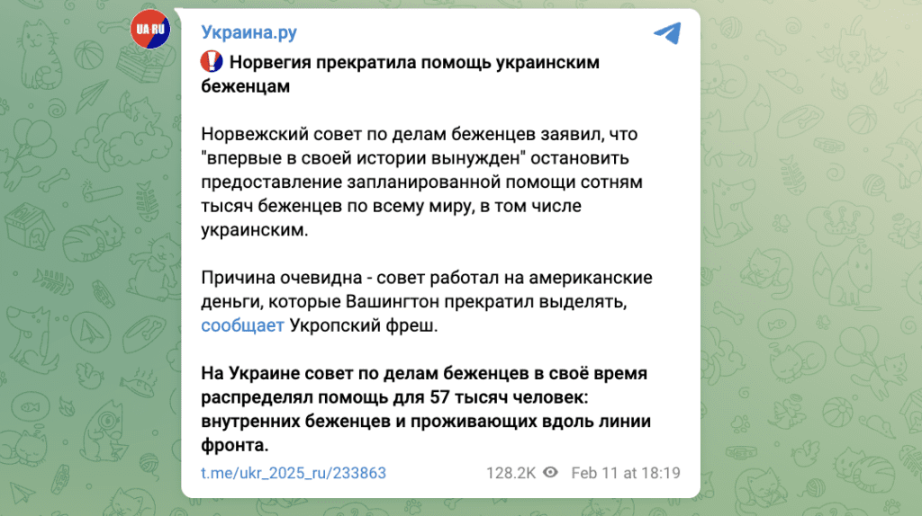 Ця інформація є маніпуляцією, оскільки в ній спеціально сплутуються рішення норвезького уряду та дії незалежної гуманітарної організації NRC, створюючи хибне  враження, що Норвегія повністю припинила допомогу українським біженцям. Насправді NRC тимчасово призупинила свою діяльність через припинення фінансування від USAID, що не вплинуло на державну політику Норвегії щодо прийому та підтримки українців. Норвезький уряд продовжує надавати підтримку незалежно від дій американських структур.