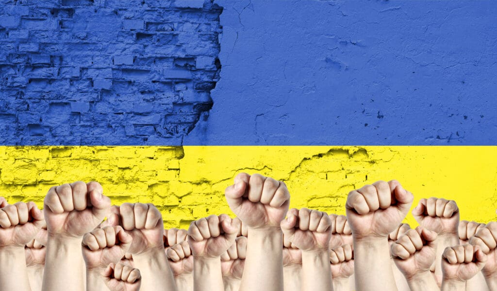 Raised fists of men against the background of the flag of Ukraine painted on the wall, the concept of popular unity and the opinion of the majority.