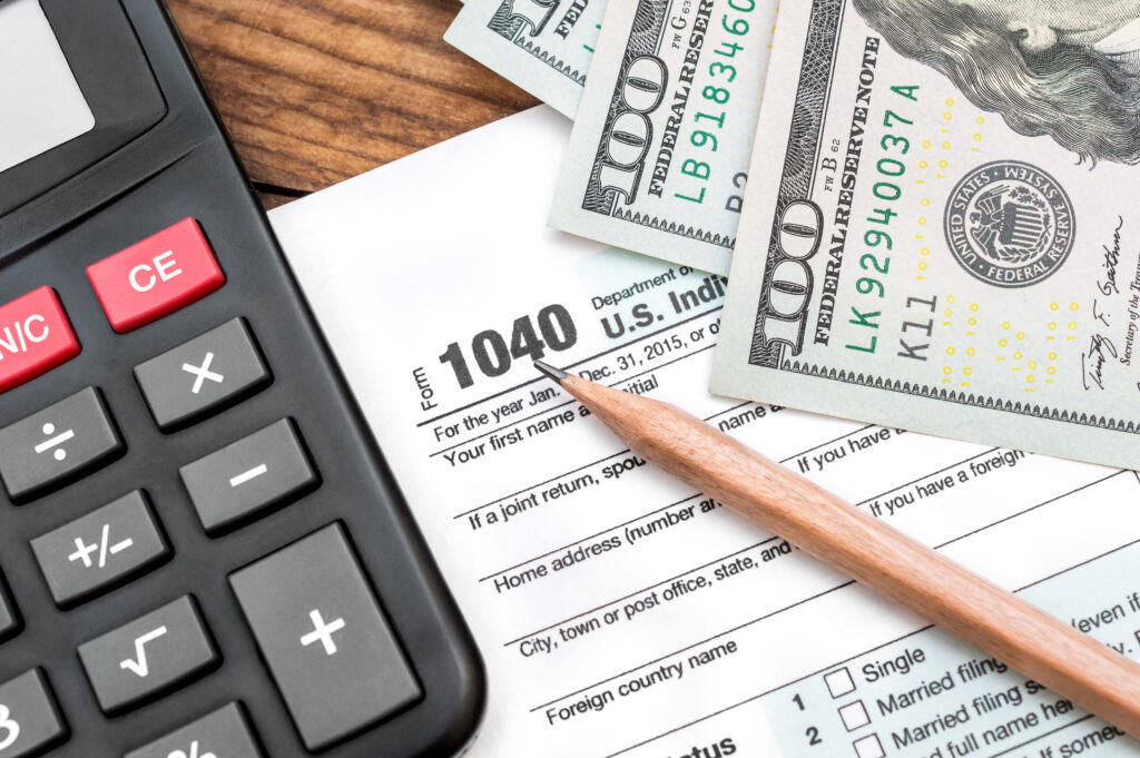 Tax form 1040 with pencil, money and calculator on the table. Business concept. Top view.
